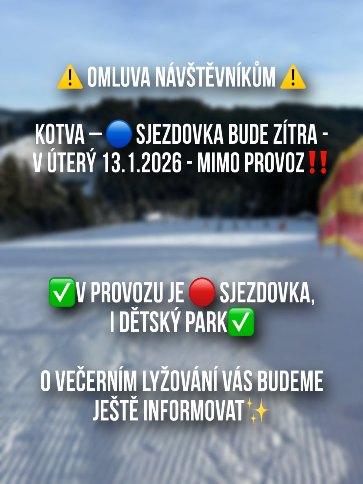 V úterý 13.ledna bude kotva A - modrá sjezdovka z technických důvodu UZAVŘENA. Večerní lyž.taky nebude. Ve středu kotva A bude v provozu bez omezení od 8:OO hodin. Červená sjezdovka a dětský park jsou v provozu bez omezení. O úterním večerním lyžováním Vás budeme informovat v průběhu dne. Děkujeme za pochopení